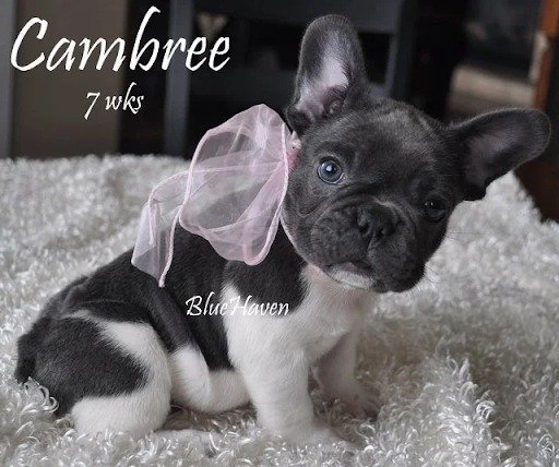 A look at our former puppies, like the beautiful Cambree at 7 weeks, highlights the quality of our work. Cambree exemplifies a heavy/blanket blue brindle pied French bulldog (and BlueHaven produces pieds in all of the other gorgeous Frenchie colors); our climate-controlled facilities and 18-member family team make sure every puppy gets plenty of love.